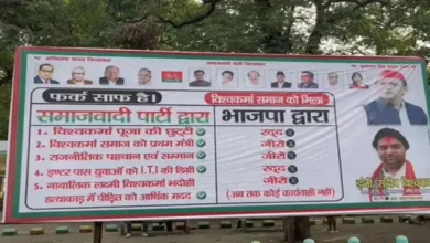 लखनऊ में सपा कार्यालय के बाहर लगी विश्वकर्मा समाज की होर्डिंग, सपा और भाजपा के कामों की हुई तुलना