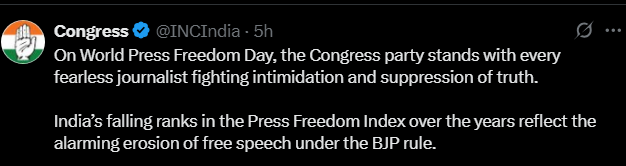 कांग्रेस ने विश्व प्रेस स्वतंत्रता दिवस पर अपने आधिकारिक ‘एक्स’ पेज पर एक पोस्ट में शनिवार को कहा , “विश्व प्रेस स्वतंत्रता दिवस पर कांग्रेस ऐसे हर निडर पत्रकार के साथ खड़ी है जो धमकी और सच को दबाने के खिलाफ लड़ रहा है। पिछले कुछ वर्षों में प्रेस स्वतंत्रता सूचकांक में भारत की गिरती रैंकिंग भाजपा शासन के तहत अभिव्यक्ति की स्वतंत्रता के खतरनाक क्षरण को दर्शाती है।”
