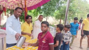 दुनका । तहसील मीरगंज क्षेत्र के गांव दुनका में शीशगढ़ – धनेटा मार्ग पर ब्रह्मदेव देवस्थान पर शरबत वितरण किया गया। मुन्नालाल के साथ उनके सहयोगियों द्वारा राहगीरों के लिए ठंडा शरबत का वितरण किया गया ज्येष्ठ माह में हर कोई अपने अपने स्तर से दान पुण्य की मंशा से शरबत वितरण करता है। मुन्नालाल ने कहा कि ज्येष्ठ माह में गर्मी प्रचंड होती है और सूर्य के तेज प्रकाश के कारण जल स्रोत सूख जाते हैं इसलिए इस महीने में जल का विशेष महत्व माना जाता है लोगों में पानी की कमी ना हो इसलिए हम सभी ने मिलकर राहगीरों के लिए यह शरबत वितरण कार्यक्रम रखा इस अवसर पर शंकर लाल चौधरी ने कहा कि इस माह में जलदान से बड़ा कोई दान नहीं होता इसलिए हम सभी को हर एक प्यासे चाहे वह पशु पक्षी ही क्यों ना हो सभी को पानी पिलाने का मौका मिले तो उससे बड़ा दान का और कोई काम नहीं हो सकता इसी मंशा को लेकर आज यह शरबत वितरण किया गया है इस अवसर पर मुन्नालाल सागर, शंकर लाल चौधरी, राजाराम ,रामचंद्र ,शुक्ल लाल ,संतोष विद्यार्थी ,पप्पू, दीनदयाल ,निर्मल , आदि लोगों ने शरबत वितरण किया।।