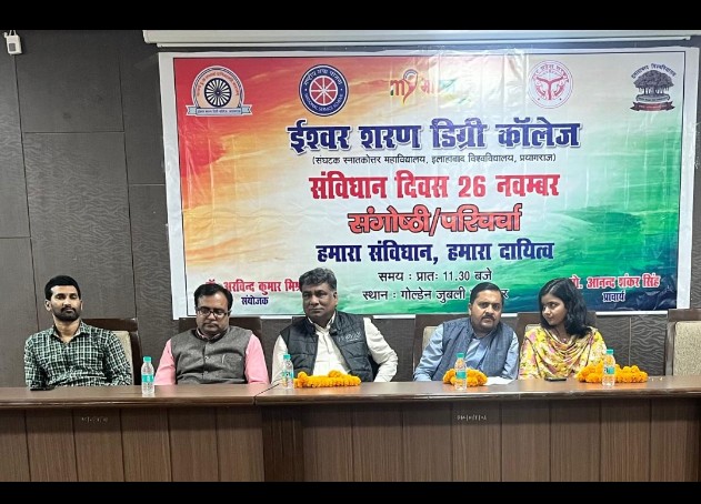 इलाहाबाद। राष्ट्रीय सेवा योजना इलाहाबाद विश्वविद्यालय के ईश्वर शरण महाविद्यालय केंद्र में संविधान दिवस के अवसर पर आयोजित संगोष्ठी एवं परिचर्चा में बोलते हुए इलाहाबाद विश्वविद्यालय के प्रो. ए.आर. सिद्दीकी ने कहा कि स्वराज और आज़ादी हमें संविधान प्रदत्त है। यह भारत ही है जहाँ देश के सर्वोच्च पद पर कोई भी नागरिक पहुँच सकता है। विभिन्नता इस देश को पूर्ण बनाती है।इलाहाबाद विश्वविद्यालय के राष्ट्रीय सेवा योजना के समन्वयक प्रो. राजेश कुमार गर्ग ने कहा कि भारत को सम्पूर्ण प्रभुत्व संपन्न और लोकतांत्रिक गणराज्य बनाने के लिए, सामाजिक आर्थिक और राजनैतिक न्याय के लिए, अवसर की समानता के लिये हमारा संविधान ही शक्तिस्रोत है। ईश्वर शरण महाविद्यालय के एन.एस.एस. प्रभारी डॉ. अरविन्द कुमार मिश्र ने कहा कि प्रतिष्ठा और अवसर की समानता, व्यक्ति की गरिमा और राष्ट्र की एकता अखंडता को सुनिश्चित करने वाली बंधुता बढ़ाने के लिए संविधान बहुत बड़ी ताकत है। इस अवसर पर महाविद्यालय के कार्यक्रम अधिकारियों डॉ. शैलेश यादव,डॉ. रफ़ाक अहमद,डॉ. गायत्री सिंह, डॉ. आलोक मिश्र सहित डॉ. जागृति पाण्डेय एवं बड़ी संख्या में स्वयंसेवक उपस्थित थे।।