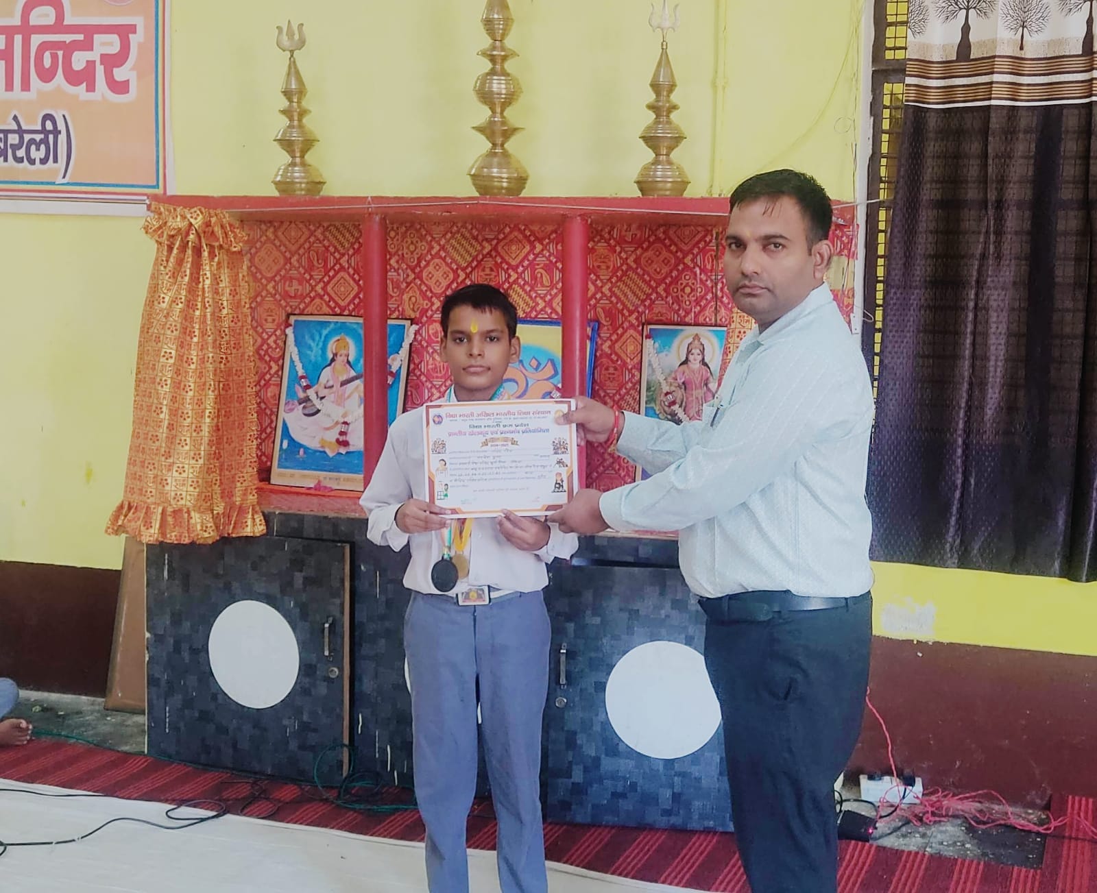 आंवला। तहसील आंवला के मोहल्ला भुर्जी टोला स्थित सरस्वती विद्या मंदिर के छात्र तनिष् पटेल ने मथुरा स्थित बाबू दाऊ दयाल एडवोकेट सरस्वती विद्या मंदिर सीनियर सेकेंडरी स्कूल में विद्या भारती बृज प्रदेश द्वारा आयोजित प्रांत स्तरीय गणित प्रयोगात्मक प्रतियोगिता में तृतीय स्थान प्राप्त कर विद्यालय का गौरव बढ़ाया। इस अवसर पर छात्र को प्रतियोगिता स्थल से कांस्य पदक एवं प्रमाण पत्र प्राप्त दिया गया । छात्र की इस उपलब्धि को लेकर विद्यालय आचार्य सुधांशु गुप्ता का विशिष्ट सहयोग रहा। तथा विद्यालय प्रधानाचार्य गवेन्द्र सिंह चौहान ने छात्र के उज्जवल भविष्य की कामना करते हुए निरंतर प्रयासरत रहने के लिए प्रेरित किया एवं वंदना सत्र में सम्मानित किया।