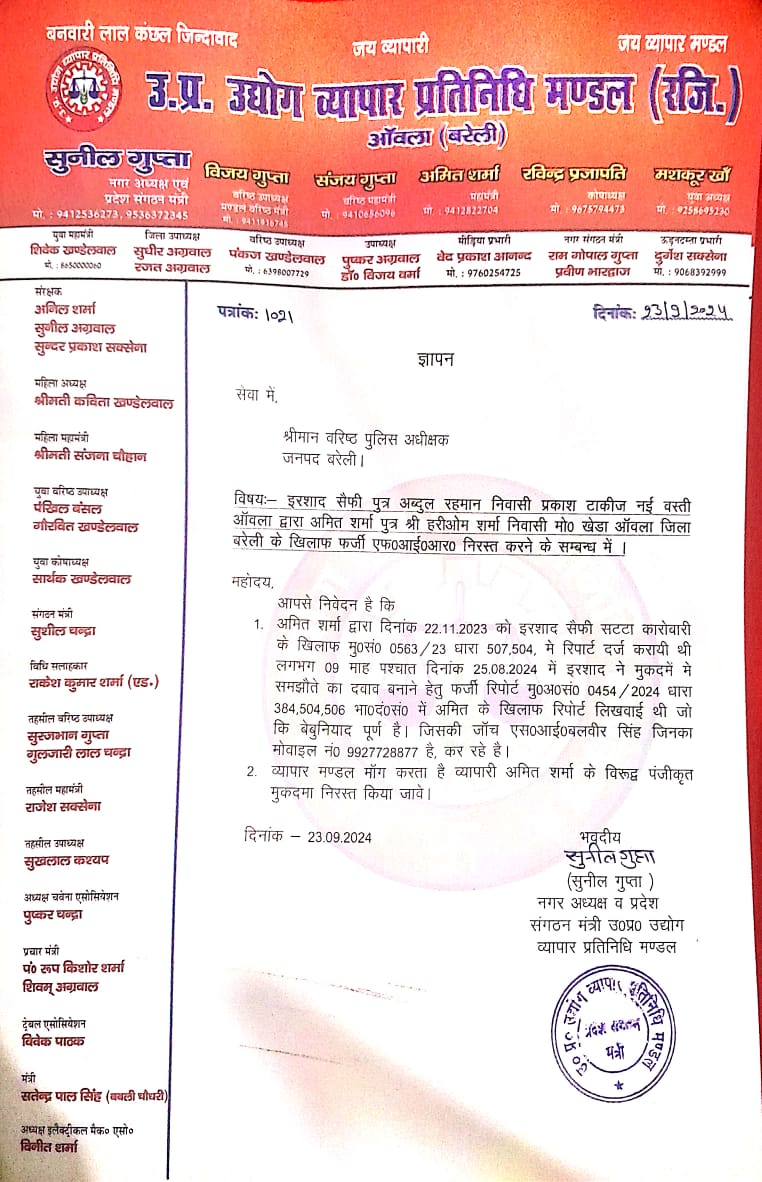 आंवला उप्र. उद्योग व्यापार प्रतिनिधिमंडल प्रांतीय संगठन मंत्री एवं नगर अध्यक्ष सुनील गुप्ता ने वरिष्ठ पुलिस अधीक्षक को शिकायत कर थाना प्रभारी निरीक्षक को हटाने की मांग की है। उन्होंने बताया कि पिछले महीने ट्रांसपोर्ट व्यापारी सुमित शर्मा से रामनगर रोड स्थित एक ढाबा संचालक के द्वारा गाली-गलौज, मारपीट की घटना कारित की गयी थी । इस मामले में एसडीएम आंवला के निर्देशानुसार पुलिस ने जांचोपरांत न तो पीड़ित का मेडिकल कराया और ना ही अभी तक कोई रिपोर्ट दर्ज की। इसके अलावाअमित शर्मा ने इरशाद सैफी के खिलाफ रिपार्ट दर्ज करायी थी लगभग 09 माह पश्चात इरशाद सैफी के द्वारा समझौते का दवाव बनाने को लेकर अमित शर्मा के विरूद्ध मुकदमा पंजीकृत कराया गया नगर में बढ़ती चोरियां सहित अन्य घटनाओं पर चिंता व्यक्त करते हुए व्यापार मंडल के पदाधिकारी सुनील गुप्ता के द्वारा वरिष्ठ पुलिस अधीक्षक से शिकायत कर थाना प्रभारी के स्थानांतरण तथा दर्ज फर्जी मुकदमो के निस्तारण कराने की मांग की है।