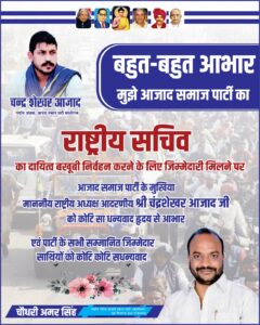 चन्द्र शेखर आजाद पर देवबंद में हुए हमले से आक्रोश में आजाद समाज पार्टी। राष्ट्रीय सचिव व पूर्व विधायक चौधरी अमर सिंह ने कहा कि शासन राष्ट्रीय अध्यक्ष चन्द्र शेखर आजाद जी को जेड श्रेणी सुरक्षा मुहैय्या कराए ताकि कोई अनहोनी न हो।
