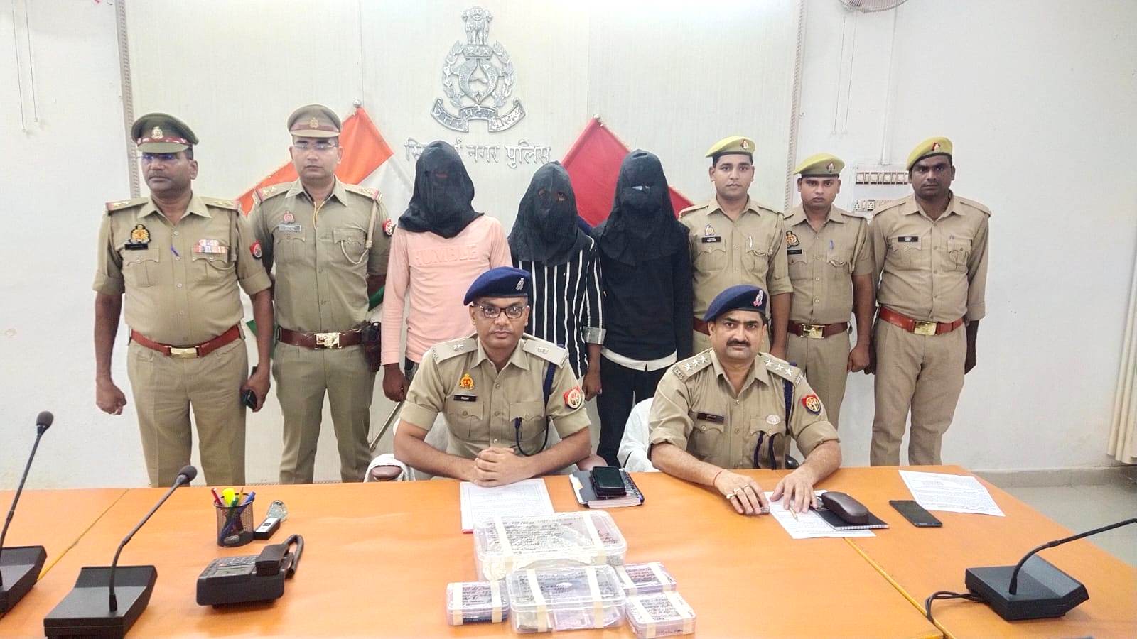 पुलिस ने तीन अभियुक्तों को किया गिरफतार चोरी का आभूषण नगद रूपए व चार मोबाइल बरामद।