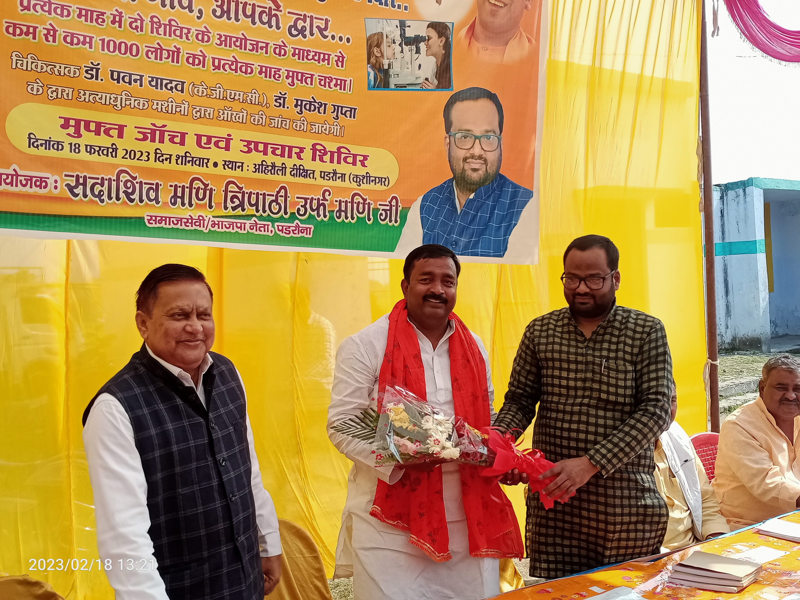 हर माह औसतन 1000 एवं वर्ष में लगभग 10000 लोगों की आंखों की जांच करा कर मुफ्त चश्मा उपलब्ध कराने के संकल्प के साथ भाजपा नेता एवं समाजसेवी सदाशिव मणि त्रिपाठी के संयोजन में मुफ्त जांच एवं चश्मा वितरण शिविर का आयोजन नगर पालिका क्षेत्र पडरौना के अंतर्गत प्राथमिक पाठशाला अहिरौली दीक्षित में आयोजित हुआ। दिन में 11:00 बजे से आयोजित यह जांच शिविर शाम 4:00 बजे तक चला। इसका उद्घाटन विधायक सदर मनीष जायसवाल मंटू एवं अपर जिलाधिकारी वित्त एवं राजस्व देवी दयाल वर्मा ने फीता काटकर किया ।