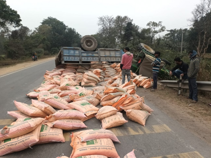 पयागपुर/ बहराइच। गोंडा बहराइच मार्ग पर बबया पुल के बुधवार को ट्रैक्टर ट्राली अनियंत्रित होकर पलट गई। जिससे ट्रैक्टर ट्रॉली पर लदी खाद सड़क पर बिखर गई। हादसे में चालक समेत चार लोग बाल बाल बच गए। जिला मुख्यालय से खाद की खेप लेकर ट्रैक्टर ट्रॉली गोंडा की ओर जा रहा था। प्रभारी निरीक्षक राज कुमार पांडेय ने बताया कि चिलवरिया स्थित गोदाम से खाद ट्रैक्टर ट्रॉली द्वारा पयागपुर जा रहा था। दोपहर में गोंडा बहराइच मार्ग पर ट्रैक्टर ट्रॉली बबया पुल के पास पलट गई। हादसे में चालक और तीन अन्य लोग बाल बाल बच गए। चालक ने सूचना खाद मालिक को दी। इसके बाद दूसरे वाहन से खाद को गंतव्य तक पहुंचाया गया। सड़क पर वाहन पलटने से कुछ देर तक जाम की स्थिति भी बन गई। बोरियां सड़क से हटाने के बाद आवागमन बहाल हो सका।