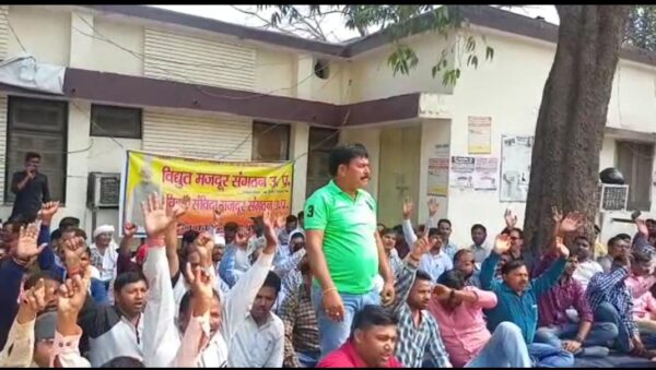 गोरखपुर: विद्युत संविदा मजदूर संगठन के संविदा कर्मियों ने अपनी 12 सूत्री मांगों को लेकर दिया धरना