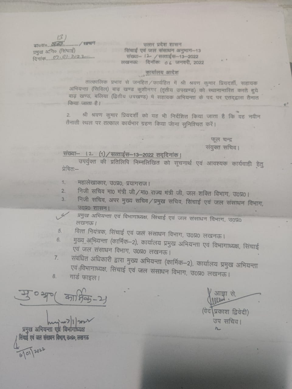 वर्ष 2022 में 7 जनवरी को उपसचिव उत्तर प्रदेश शासन सिंचाई एवं जल संसाधन अनुभाग – 13 वेद प्रकाश द्विवेदी के द्वारा आदेश जारी हुआ, जिसमें जनहित एवं कार्य हित में श्रवण कुमार प्रियदर्शी सहायक अभियंता सिविल बाढ़ खंड कुशीनगर( तृतीय उपखंड )को बाढ़ खंड बलिया( द्वितीय उपखंड) में तत्काल प्रभाव से स्थानांतरित करते हुए अपना कार्यभार ग्रहण करने के लिए निर्देशित किया गया था।
