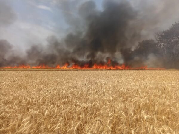 भटनी-देवरिया। दिन शनिवार को जिगनी चौराहा के समीप कंपाइन से कराई गई कटिंग का भूसा मशीन द्वारा भूसा बनाया जा रहा था। इसी दौरान एक चिंगारी छिटक कर डंठल पर जा गिरी और उसके बाद ठंडल में आग लग गई जो कि तनिक ही देर में विकराल हो गई। हवा के लपटों में किसानों की खड़ी फसल एवं हाथ से काटे गये गेहूं के गट्ठर जलने लगे। एक महिला ने अपने खेत में आग लगने के कुछ देर पहले ही थ्रेसर से गेंहू की मड़ाई कराई थी उसका  उनका भूसा और गेहूं जलकर राख हो गया। महिला की आंखों से आंसू लगातार बह रहे थे। आग को बुझाने के लिए जिगनी, मिश्रौली, खिरिया, पिपरा दीक्षित आदि गांव के लोगों की कड़ी मेहनत के बाद आग पर काबू पाया गया। हवा बहुत तेज थी जिसमें उसमें  आग बुझाना संभव नहीं था।  सूचना के अनुसार 5 लोगों का नुकसान हुआ है। दीनदयाल गुप्ता, मदन प्रजापति, रामध्रुव प्रसाद, सीताराम यादव, सोनू यादव एवं अन्य लोगों इस आग से ग्रसित रहे। पीड़ित और उपस्थित लोगों द्वारा बताया गया कि जब भी आग लगती है तो दमकल की गाड़ी आग बुझने के बाद ही आती है। पांच बजने तक अग्निशमन की गाड़ी नहीं पहुँची थी।