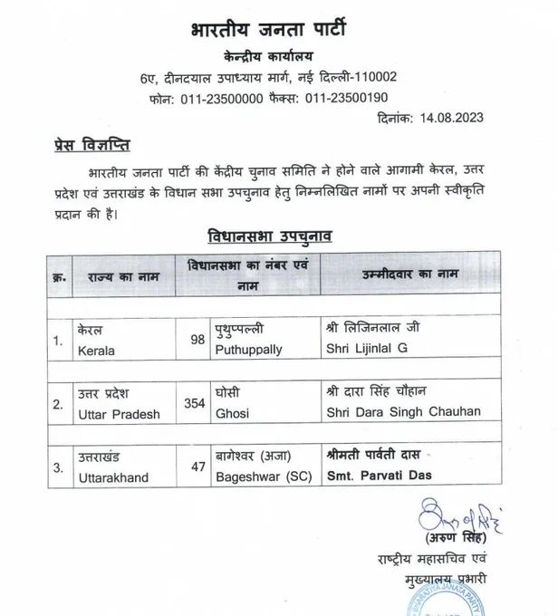 बता दें घोसी सीट पर होने वाले उपचुनाव के लिए 17 अगस्त तक नामांकन होगा और नाम वापसी के लिए उम्मीदवारों को 21 अगस्त तक का समय दिया गया है। घोसी सीट के उपचुनाव के लिए 5 सितम्बर को मतदान होगा और 8 सितंबर को वोटों की गिनती होगी।