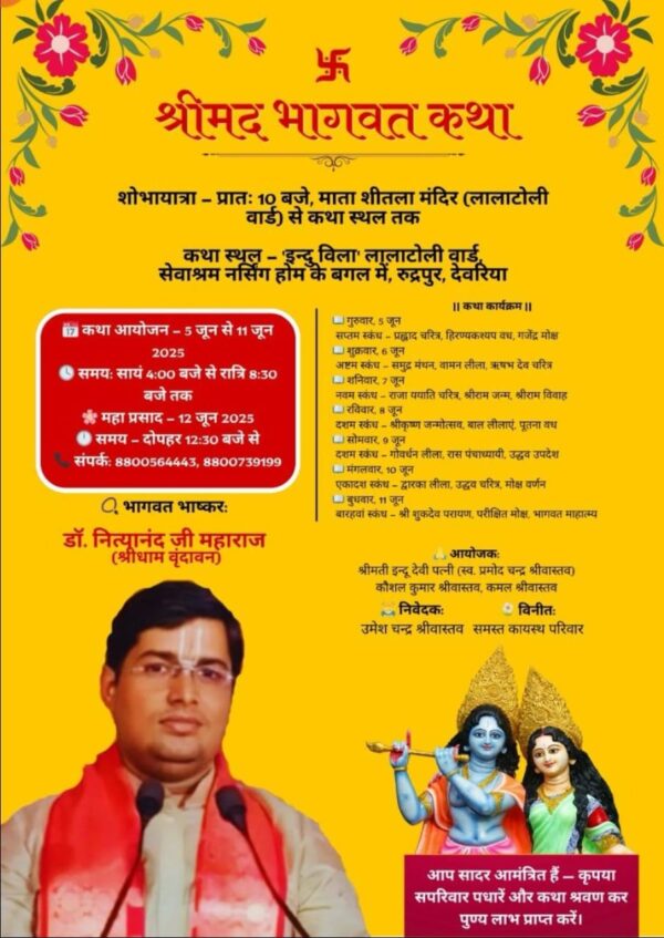 देवरिया/रुद्रपुर। जनपद के रुद्रपुर कस्बे स्थित लालाटोली वार्ड में इस वर्ष आध्यात्मिक चेतना से ओतप्रोत सात दिवसीय श्रीमद्भागवत कथा महोत्सव का आयोजन किया जा रहा है। यह पावन आयोजन 5 जून से प्रारंभ होकर 11 जून 2025 तक चलेगा, जिसका शुभारंभ 5 जून को प्रातः 10 बजे माता शीतला मंदिर, लालाटोली वार्ड से कथा स्थल तक शोभायात्रा के साथ होगा। शोभायात्रा नगर के विभिन्न मार्गों से होती हुई इन्दु विला (सेवाश्रम नर्सिंग होम के बगल) स्थित कथा स्थल तक पहुंचेगी, जहां प्रतिदिन शाम 4 बजे से रात्रि 8:30 बजे तक श्रीमद्भागवत की रसवर्षा होगी।