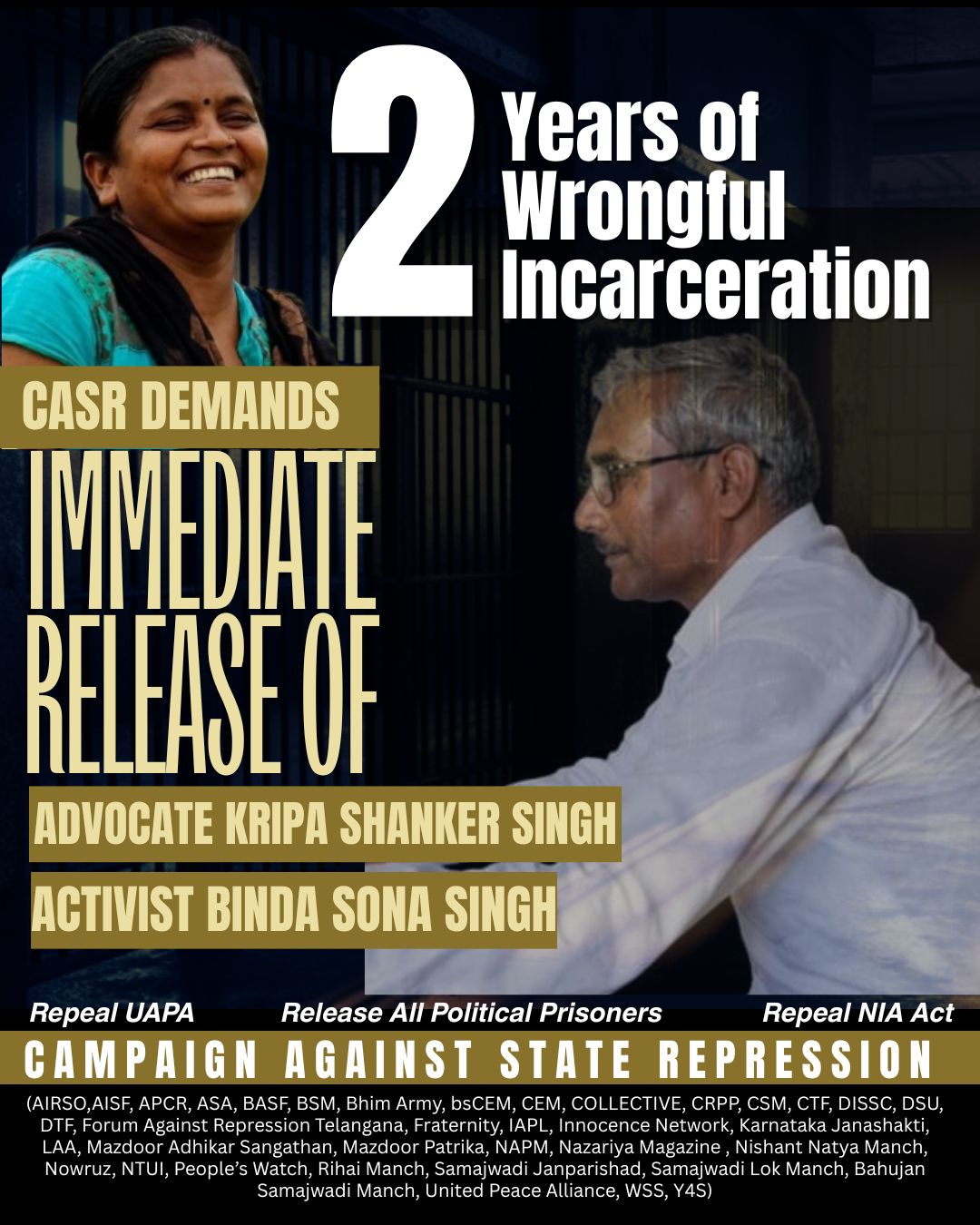 भीम आर्मी, रिहाई मंच और मजदूर पत्रिका सहित दर्जनों संगठनों के गठबंधन CASR ने साफ कहा है कि बिना दोष सिद्ध हुए दो साल की कैद न्याय नहीं, बल्कि तंत्र द्वारा दी गई प्रताड़ना है। उन्होंने मांग की है कि:
