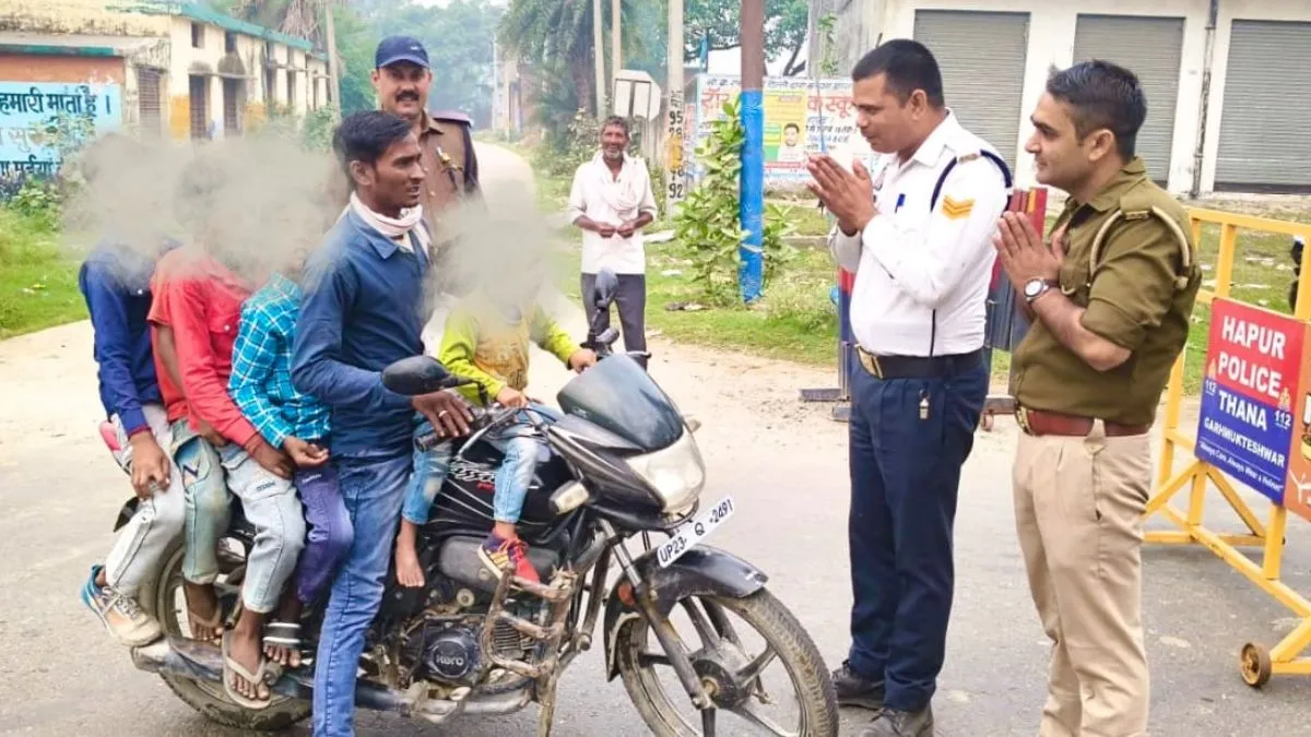 बता दें कि गढ़मुक्तेश्वर क्षेत्र में एक चेक पोस्ट पर पुलिसकर्मियों ने 4 नवंबर को दोपहर करीब साढ़े 11 बजे एक बाइक पर सवार 7 लोगों को रोका. बाइक रुकने पर पुलिसकर्मियों ने देखा कि उसपर करीब 3 साल से लेकर 10 साल तक की उम्र के बच्चों के साथ बाइक सवार शख्स सहित कुल 7 लोग सवार हैं. 7 लोगों को देखते ही पुलिसकर्मी हैरत में पड़ गए. शख्स छोटे-छोटे बच्चों के साथ बिना हेलमेट लगाए अपनी और मासूम बच्चों की जिंदगी को खतरे में डालकर सड़क पर सफर कर रहा था. बाइक सवार ने 2 बच्चों को बाइक की पेट्रोल टंकी के ऊपर और अन्य को बाइक की सीट से लेकर पीछे वाली लाइट तक बैठाया हुआ था.