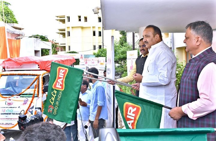 दुबई भेजी जा रही आमों की खेप को मंत्री दिनेश प्रताप सिंह ने हरी झंडी दिखाकर किया गया रवाना