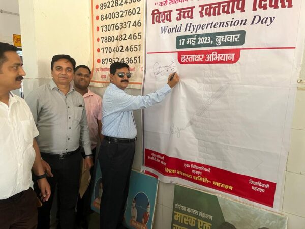 बहराइच। विश्व उच्चरक्त चाप दिवस के अवसर पर सीएमओ कार्यालय समेत जनपद की समस्त स्वास्थ्य इकाइयों पर जन जागरूकता अभियान और स्क्रीनिंग कैम्प के साथ हस्ताक्षर अभियान चलाकर मनाया गया। सीएमओ कार्यालय सभागार में सीएमओ डॉ० सतीश कुमार सिंह की अध्यक्षता में जन जागरूकता गोष्ठी और हस्ताक्षर अभियान का आयोजन किया गया। गोष्ठी को संबोधित करते हुए सीएमओ डॉ० सतीश कुमार सिंह ने कहा कि वर्ल्ड हाइपरटेंशन डे मनाने का उद्देश्य हाई ब्लड प्रेशर की बीमारी को लेकर लोगों को जागरूक करना है। हाइपरटेंशन को हाई बीपी भी कहा जाता है।